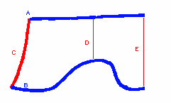 The distance between the bottom of Line C and Line E should be half the round measure of the lowest portion of your neck so that when the pattern is transfered symetrically it's the circumfrence of your neck. Everybody's built differently but line C would probably taper near the top of the neck. Line C represents the distance from the top of your neck to the back of the suit, Line D the distance fron the top of the neck to the shoulder of the suit, Line E top of the neck to the front of the main body suit.